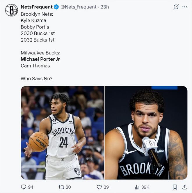 但篮网媒体还想得到更多的首轮签,他们建议雄鹿出库兹马、波蒂斯、2030年雄鹿首轮、2032年雄鹿首轮,得到小迈克尔-波特、卡姆-托马斯,这样扬尼斯可以得到两个帮手,篮网如果能得到两个首轮签就不会跟活塞交易。