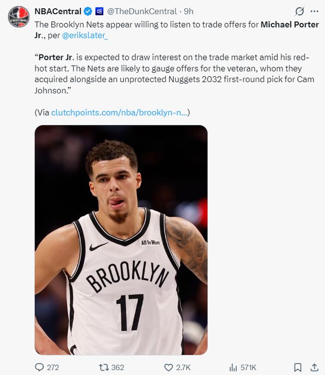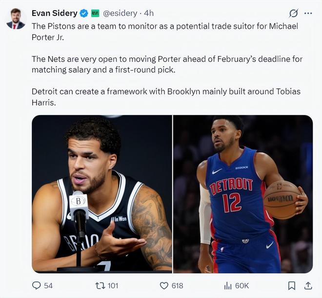 根据NBA记者埃文-斯迪瑞的说法,底特律活塞队会成为小迈克尔-波特的潜在下家,活塞队愿意围绕托比亚斯-哈里斯来换他,篮网队的要价是一个首轮签。