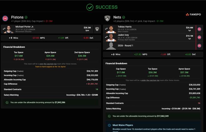 但一个托哈只有2260万,小波特是3830万,所以要配平的话还得加上一个1010万的艾维,艾维此前就摆上货架,他已经不在活塞的培养计划之内。